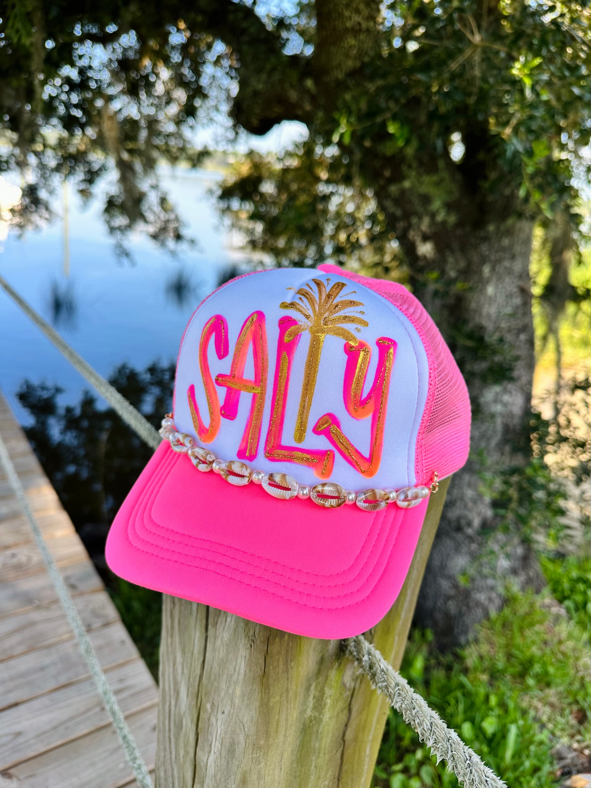 Hot pink trucker hat. Adjustable. Handpainted with seashell chain.